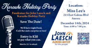 Join Mayoral candidate John Laesch to celebrate the holidays with Karaoke, food, drinks and more! Meet us at Miss Lee’s (215 E Galena, Aurora) on Saturday, December 14th 4pm – 7pm.